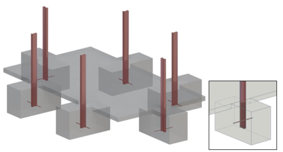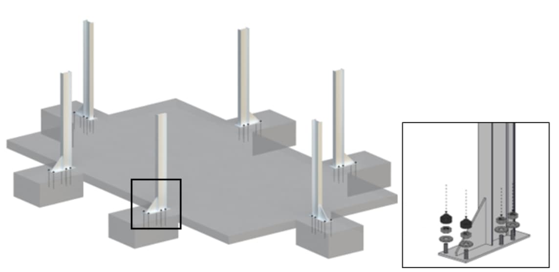 I supporti in acciaio vengono fissati chimicamente a una soletta in calcestruzzo armato già realizzata.