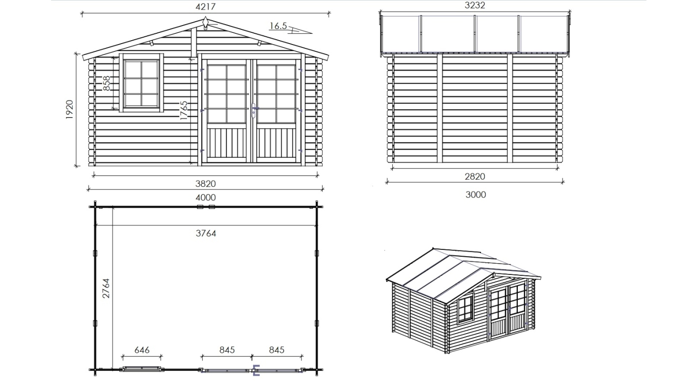 Le foto mostrano una casetta in legno DOM710 con una superficie di 12m2, una larghezza frontale di 4m e una profondità di 3m.