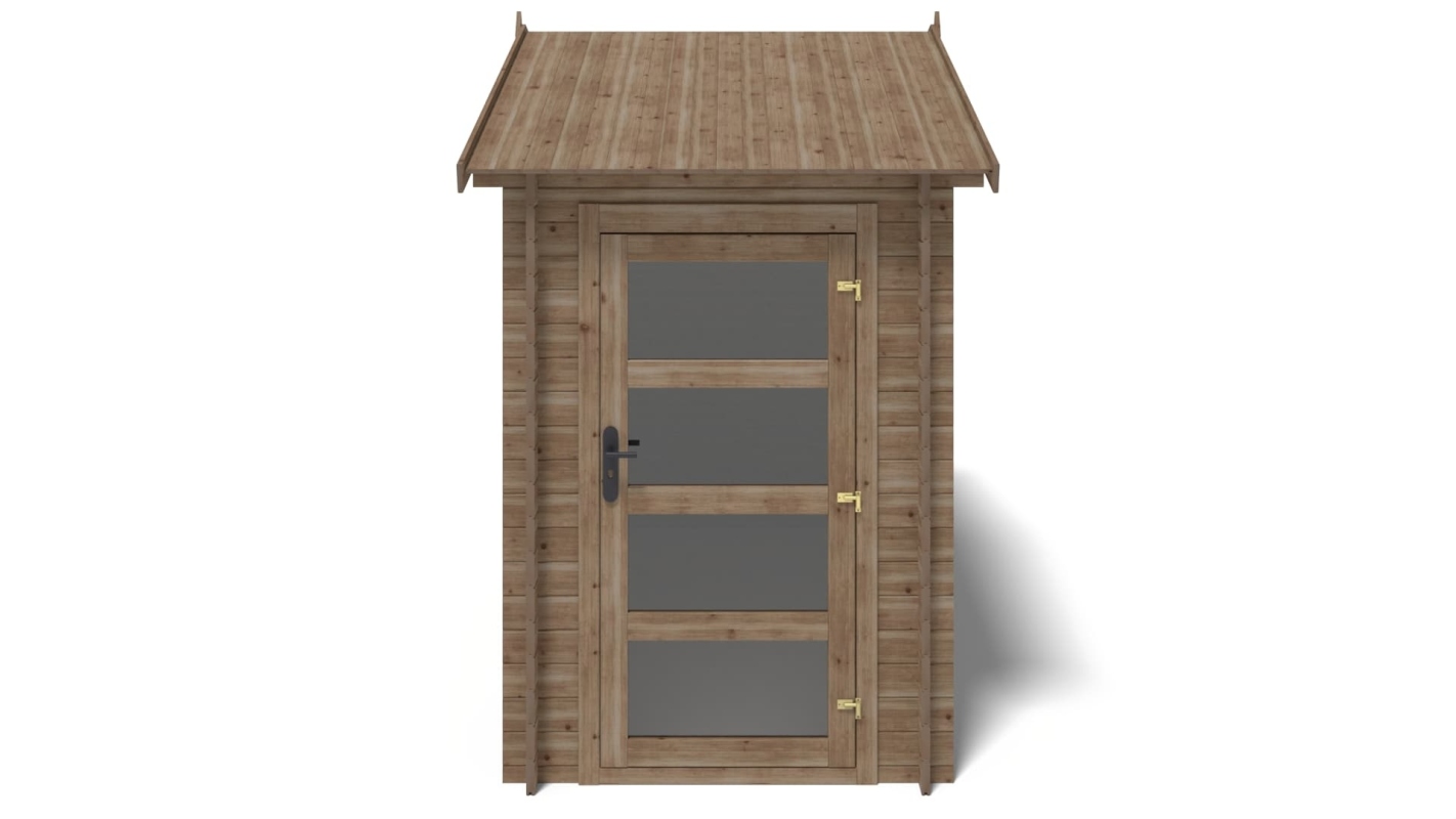 Le foto mostrano una casetta in legno DOM673 con una superficie di 4.5m2, una larghezza frontale di 1.5m e una profondità di 3m.