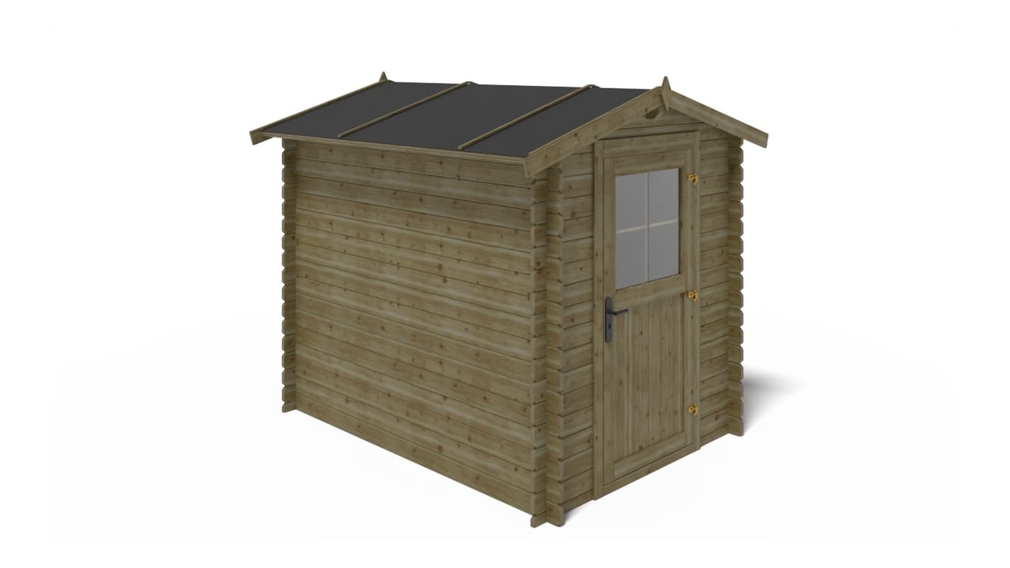 Le foto mostrano una casetta in legno DOM415 con una superficie di 4.75m2, una larghezza frontale di 1.9m e una profondità di 2.5m.