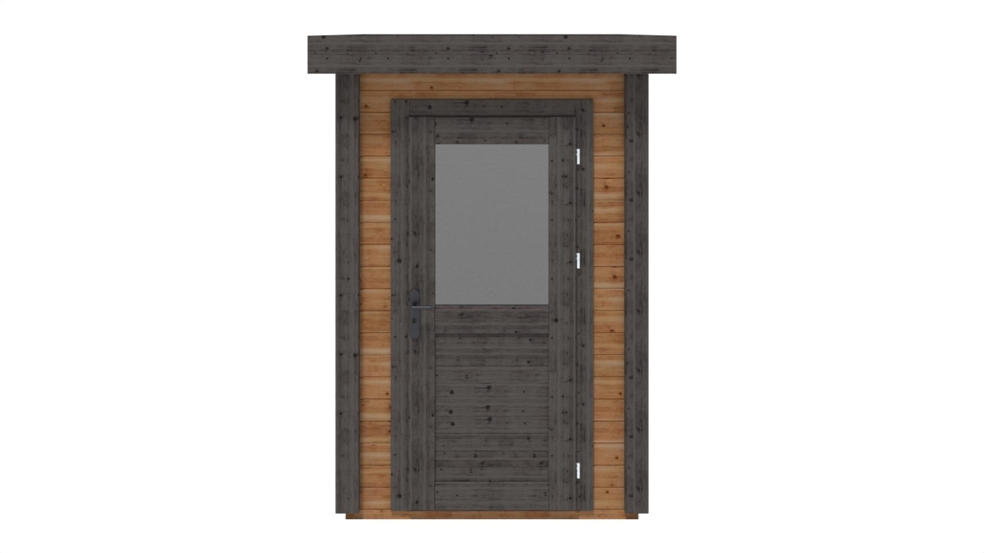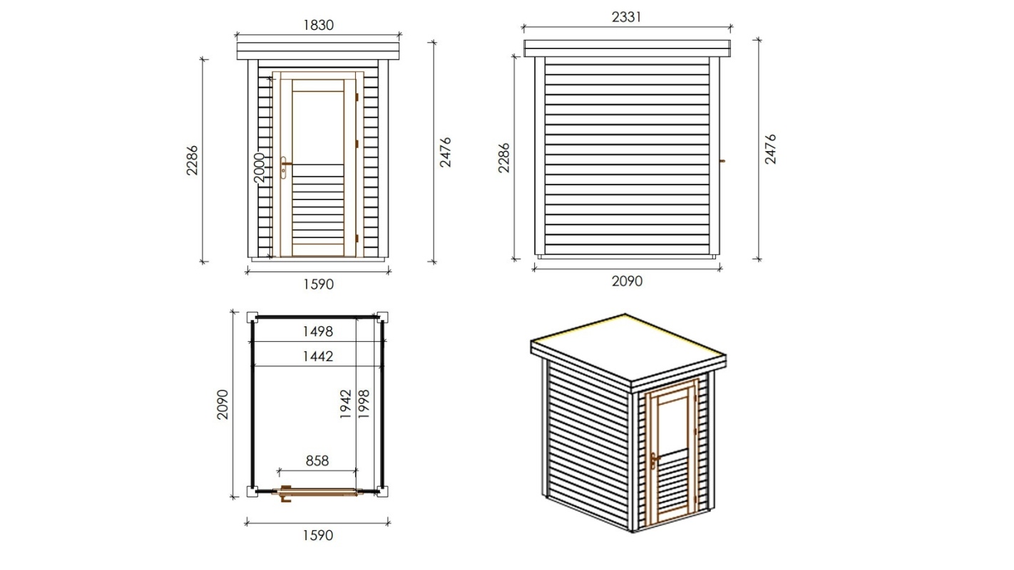 Le foto mostrano una casetta in legno 000011 con una superficie di 3.32m2, una larghezza frontale di 1.59m e una profondità di 2.09m.