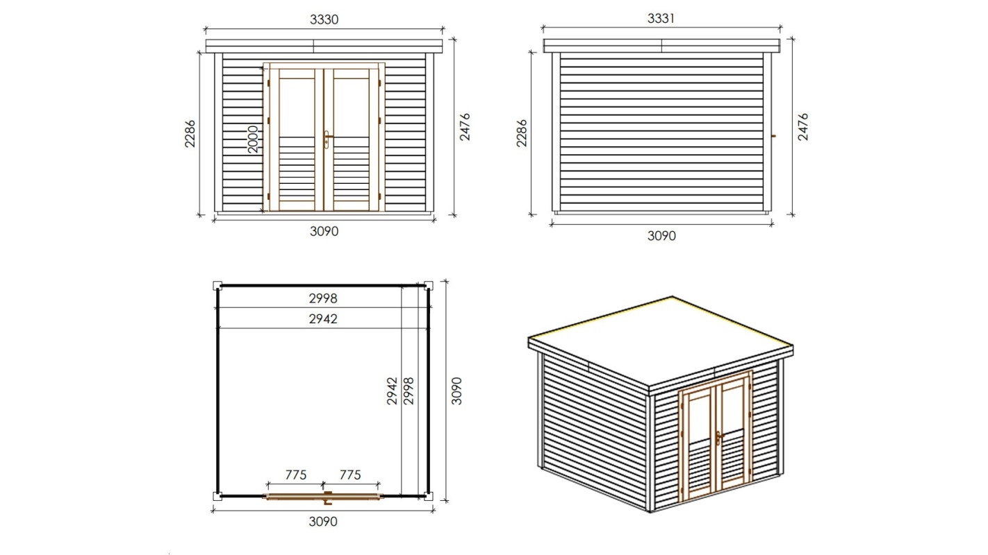 Le foto mostrano una casetta in legno 000023 con una superficie di 9.55m2, una larghezza frontale di 3.09m e una profondità di 3.09m.