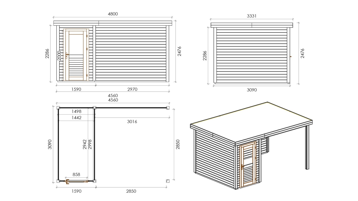 Le foto mostrano una casetta in legno 000037 con una superficie di 14.09m2, una larghezza frontale di 1.59m e una profondità di 3.09m.
