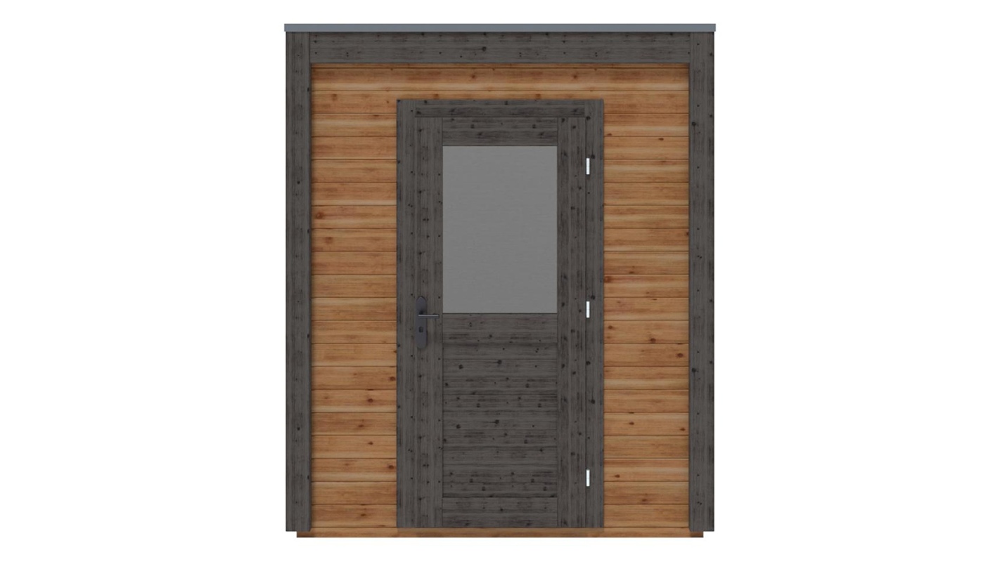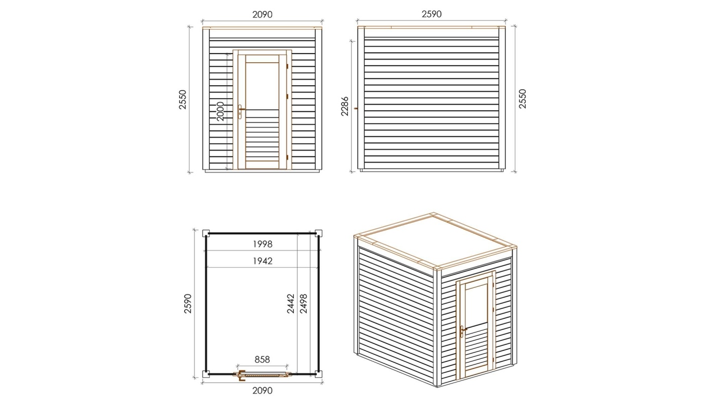 Le foto mostrano una casetta in legno 000065 con una superficie di 5.41m2, una larghezza frontale di 2.09m e una profondità di 2.59m.