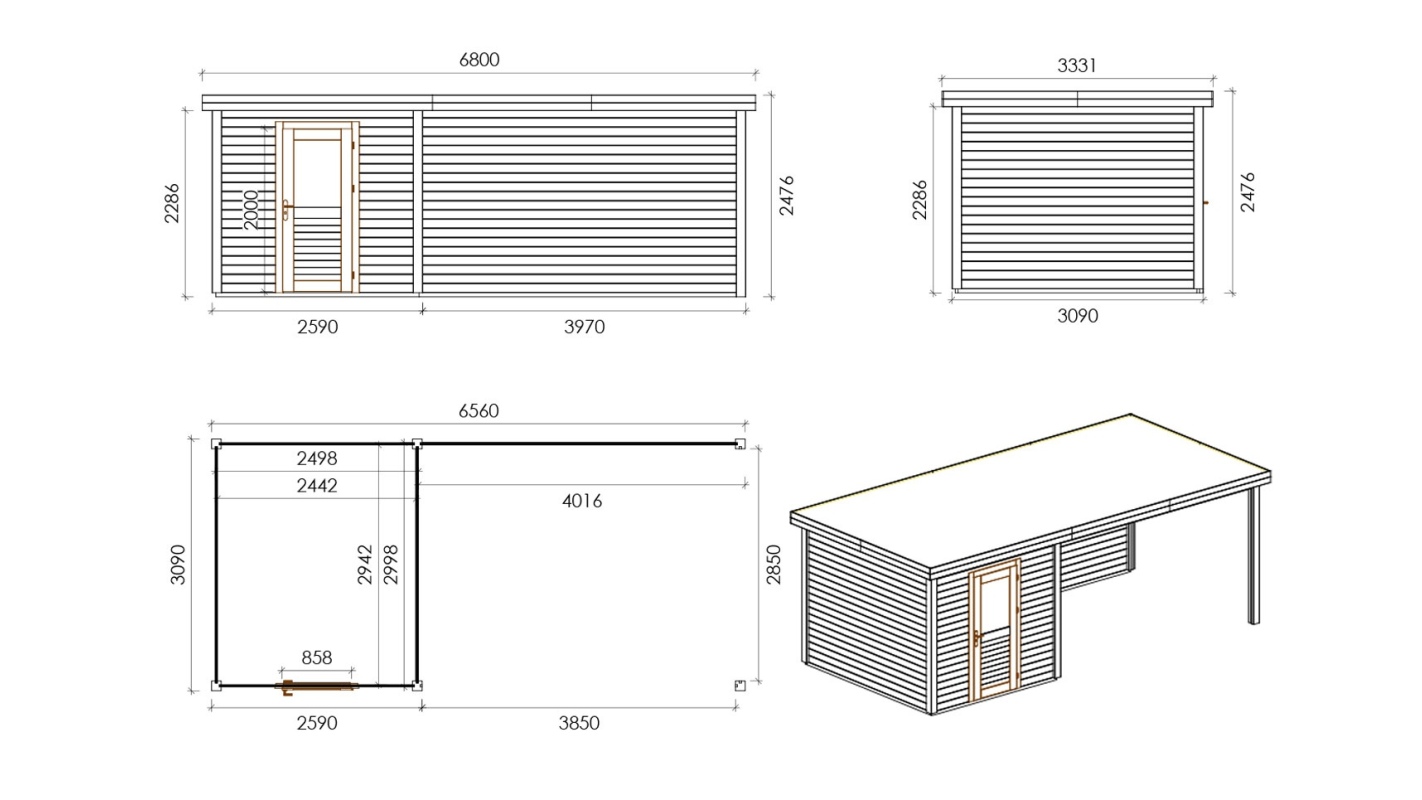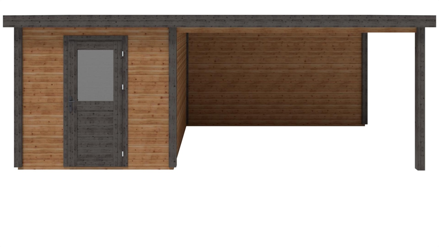 Le foto mostrano una casetta in legno 000048 con una superficie di 20.27m2, una larghezza frontale di 2.59m e una profondità di 3.09m.