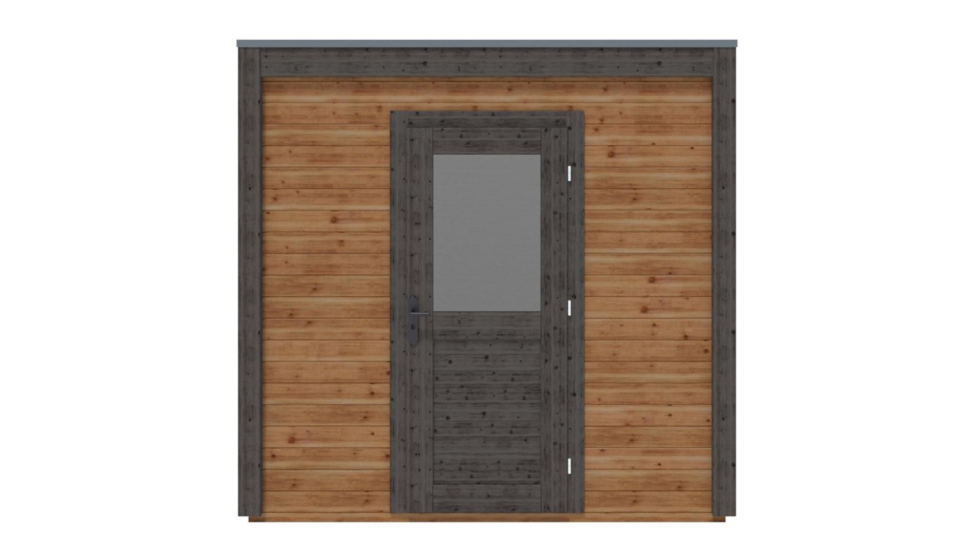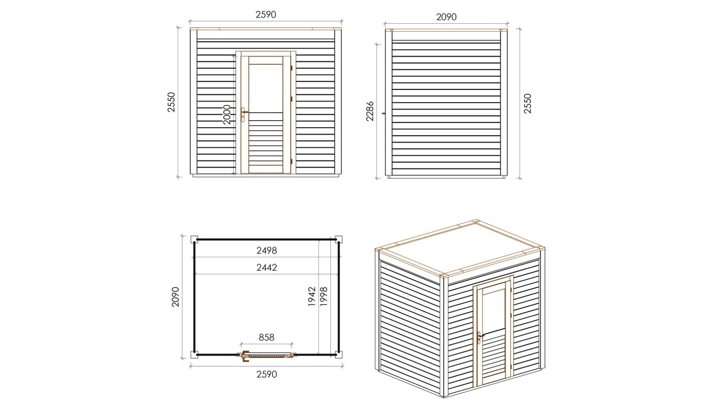 Le foto mostrano una casetta in legno 000068 con una superficie di 5.41m2, una larghezza frontale di 2.59m e una profondità di 2.09m.