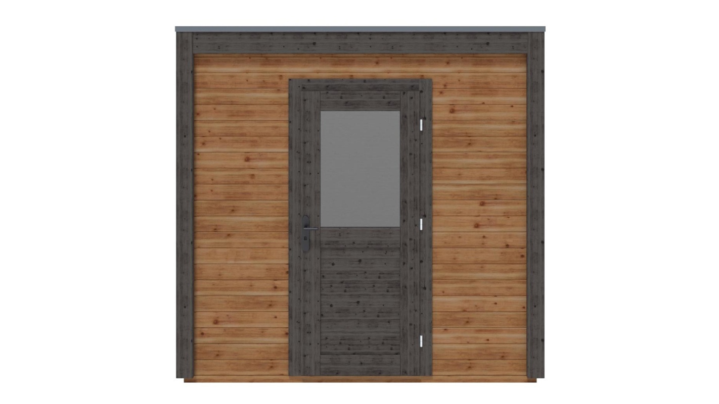 Le foto mostrano una casetta in legno 000069 con una superficie di 6.71m2, una larghezza frontale di 2.59m e una profondità di 2.59m.