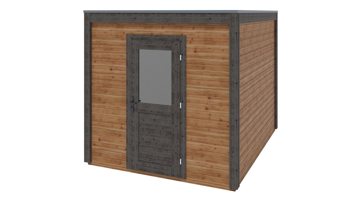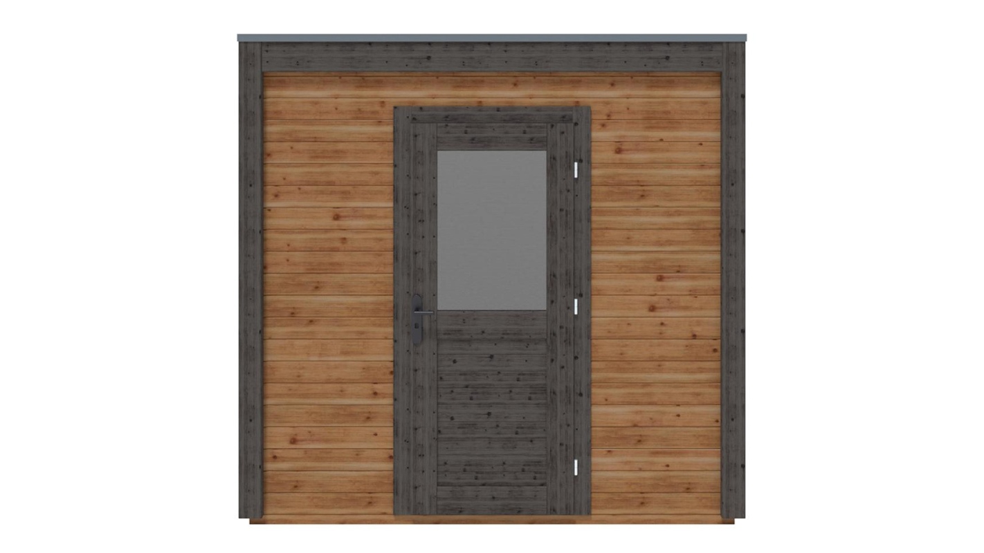 Le foto mostrano una casetta in legno 000070 con una superficie di 8m2, una larghezza frontale di 2.59m e una profondità di 3.09m.