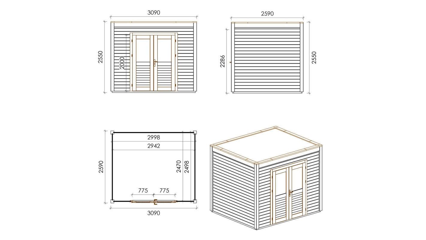 Le foto mostrano una casetta in legno 000071 con una superficie di 8m2, una larghezza frontale di 3.09m e una profondità di 2.59m.