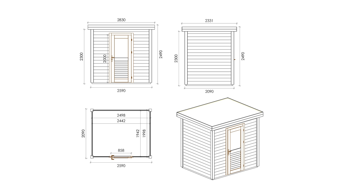 Le foto mostrano una casetta in legno 000117 con una superficie di 5.41m2, una larghezza frontale di 2.59m e una profondità di 2.09m.
