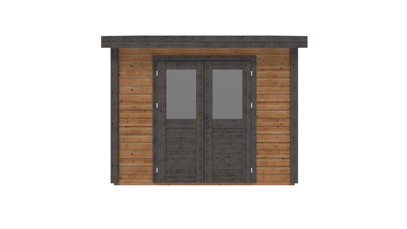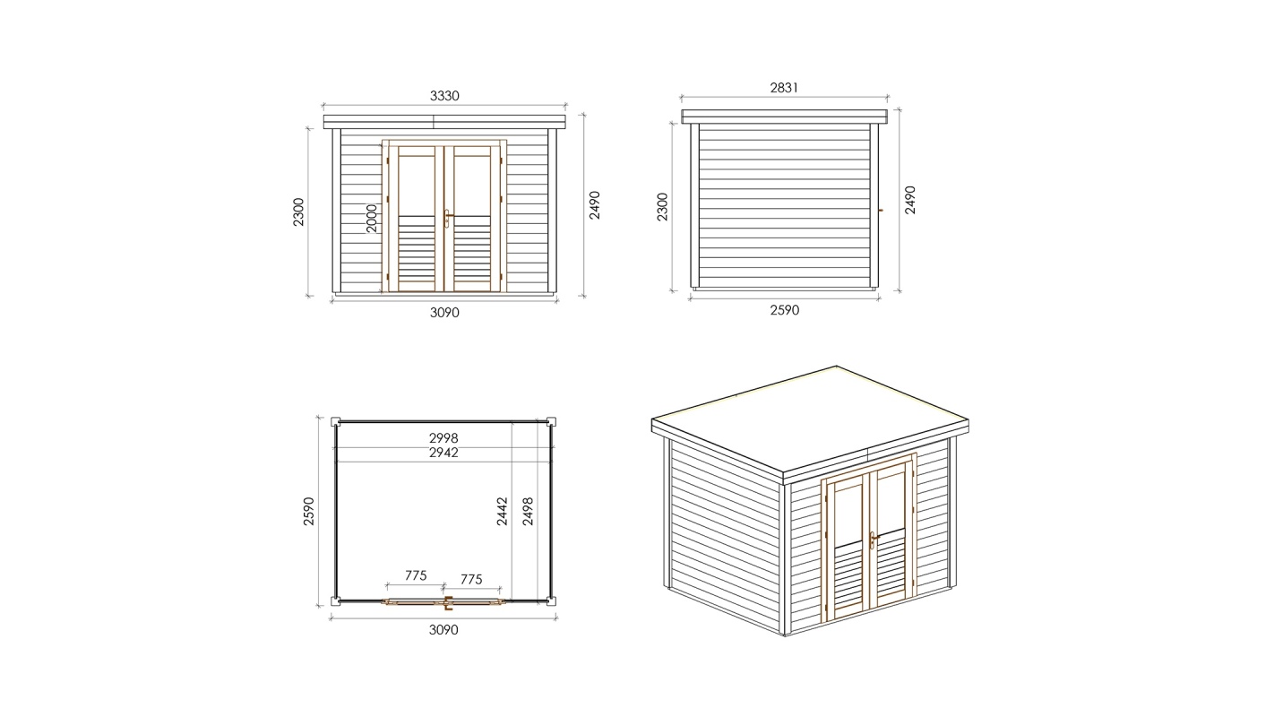 Le foto mostrano una casetta in legno 000120 con una superficie di 8m2, una larghezza frontale di 3.09m e una profondità di 2.59m.