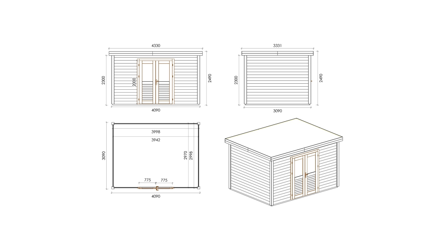 Le foto mostrano una casetta in legno 000124 con una superficie di 12.64m2, una larghezza frontale di 4.09m e una profondità di 3.09m.