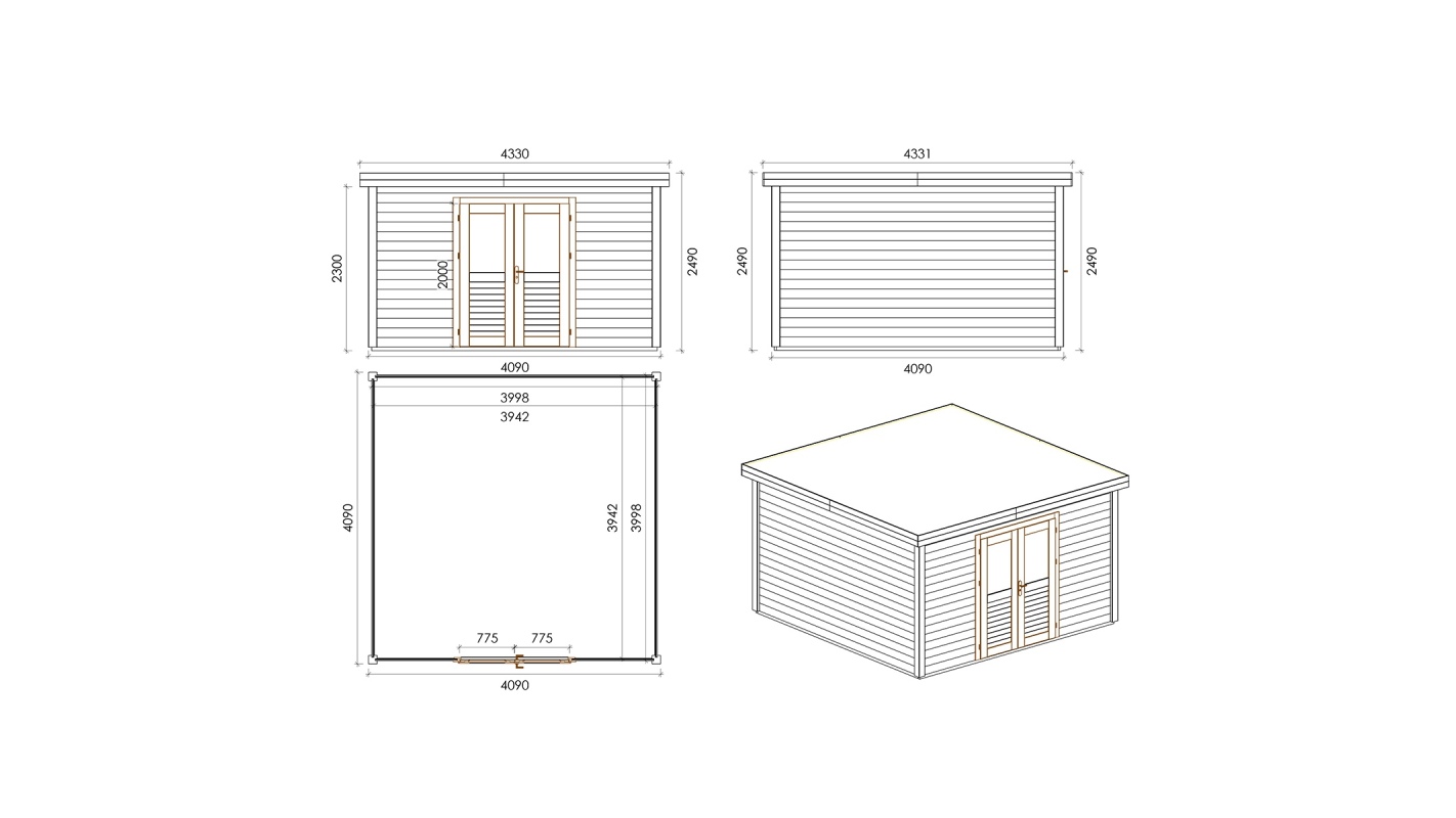 Le foto mostrano una casetta in legno 000125 con una superficie di 16.73m2, una larghezza frontale di 4.09m e una profondità di 4.09m.
