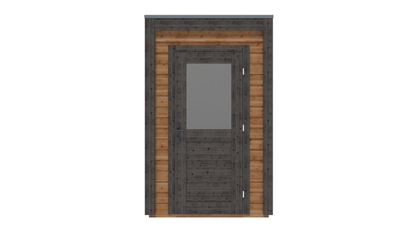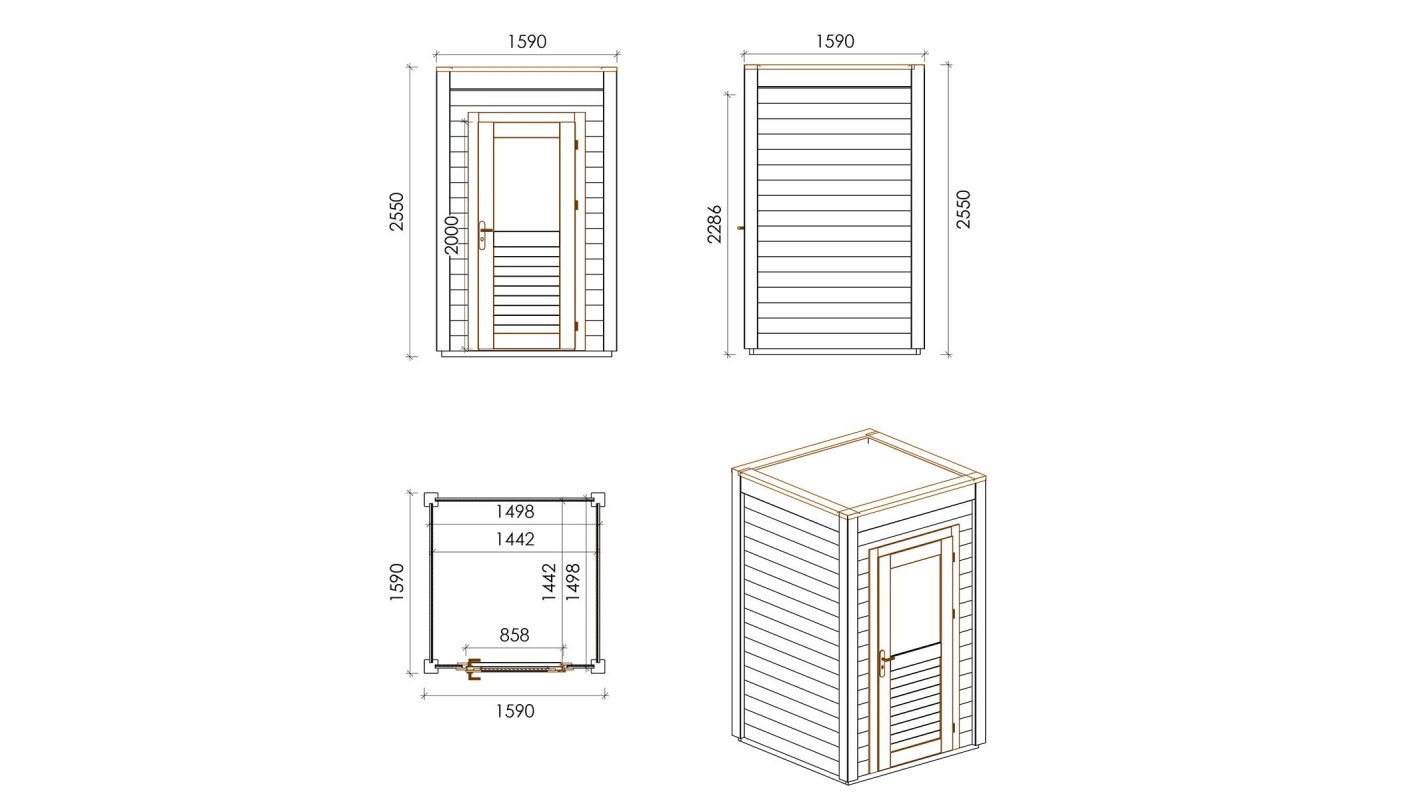 Le foto mostrano una casetta in legno 000157 con una superficie di 2.53m2, una larghezza frontale di 1.59m e una profondità di 1.59m.