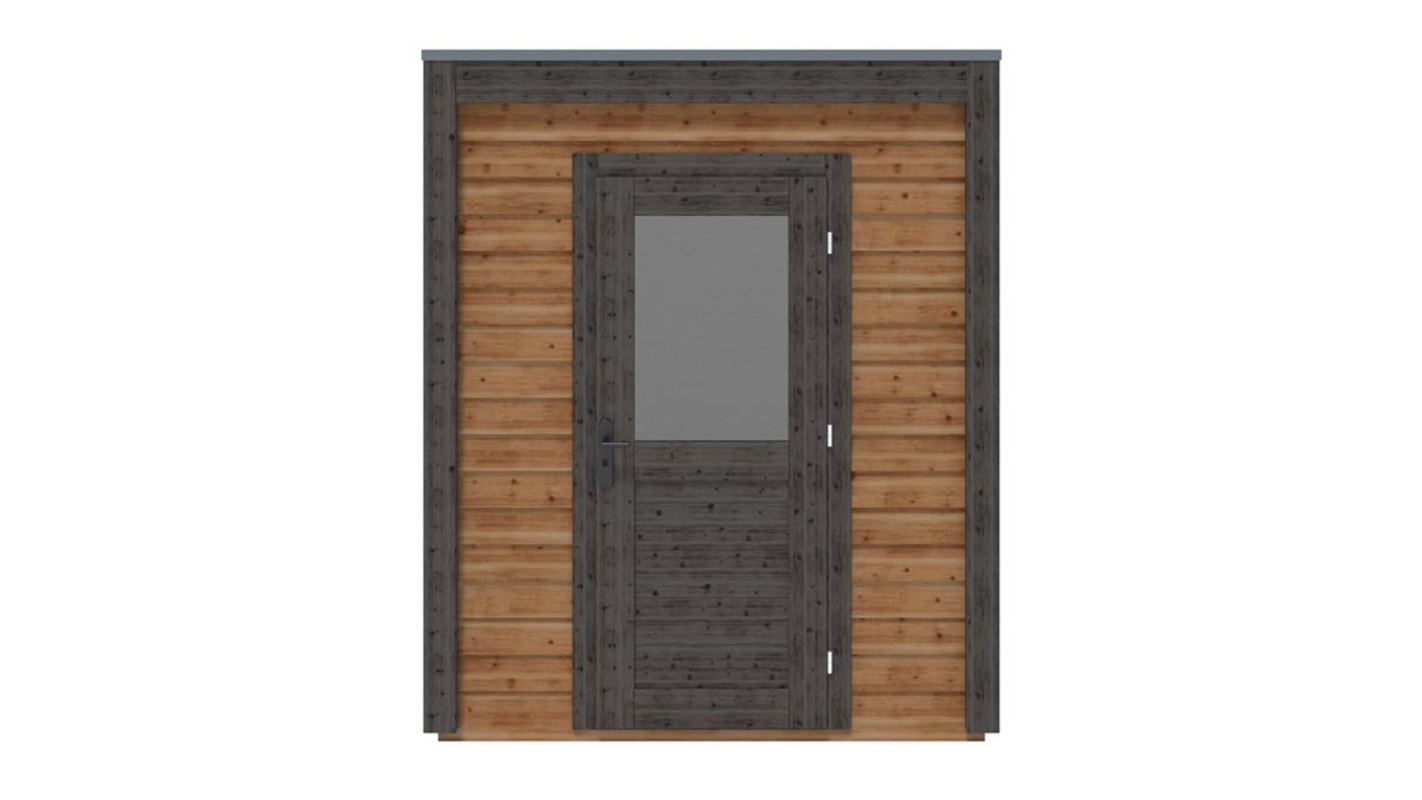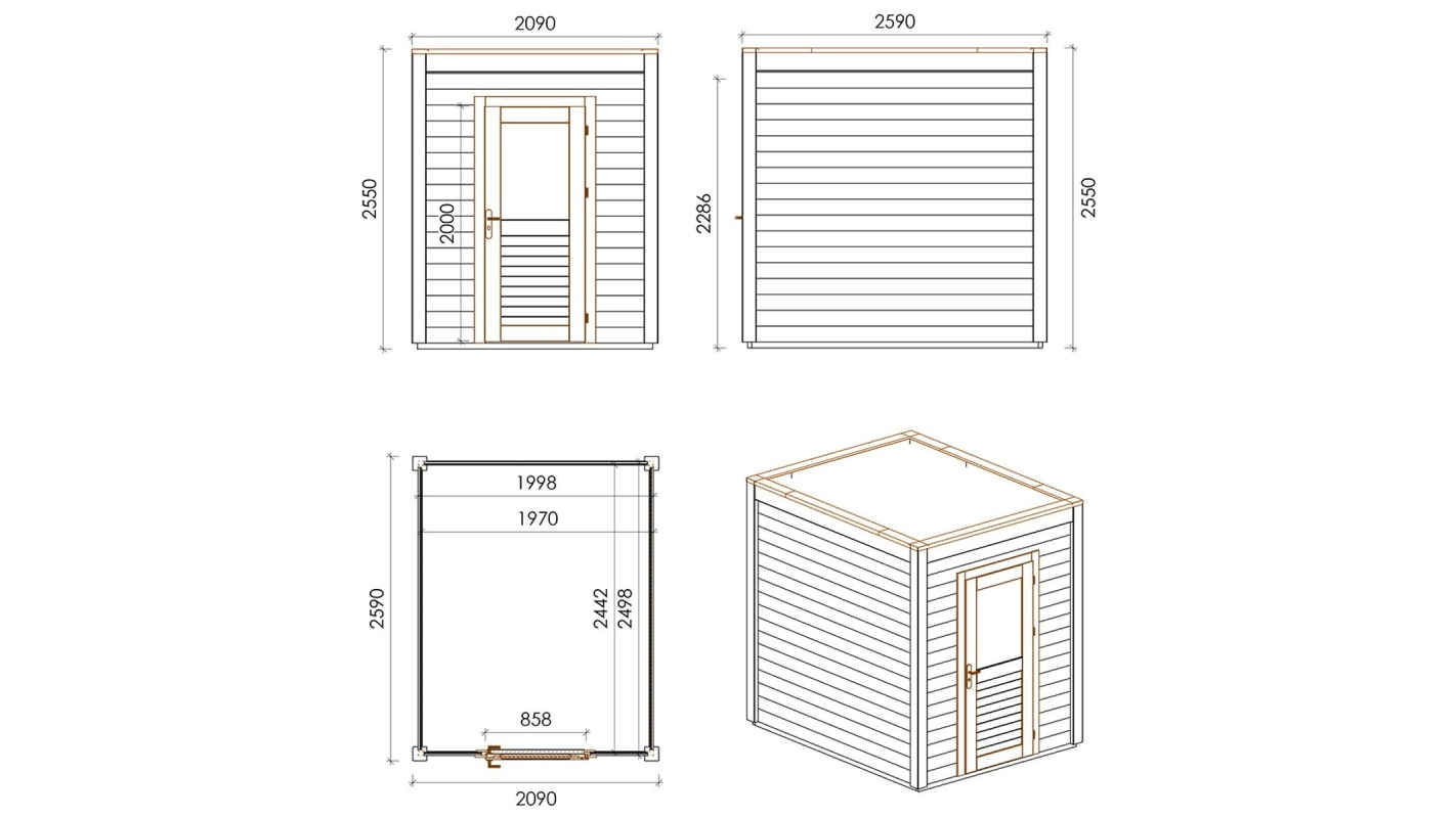 Le foto mostrano una casetta in legno 000163 con una superficie di 5.41m2, una larghezza frontale di 2.09m e una profondità di 2.59m.