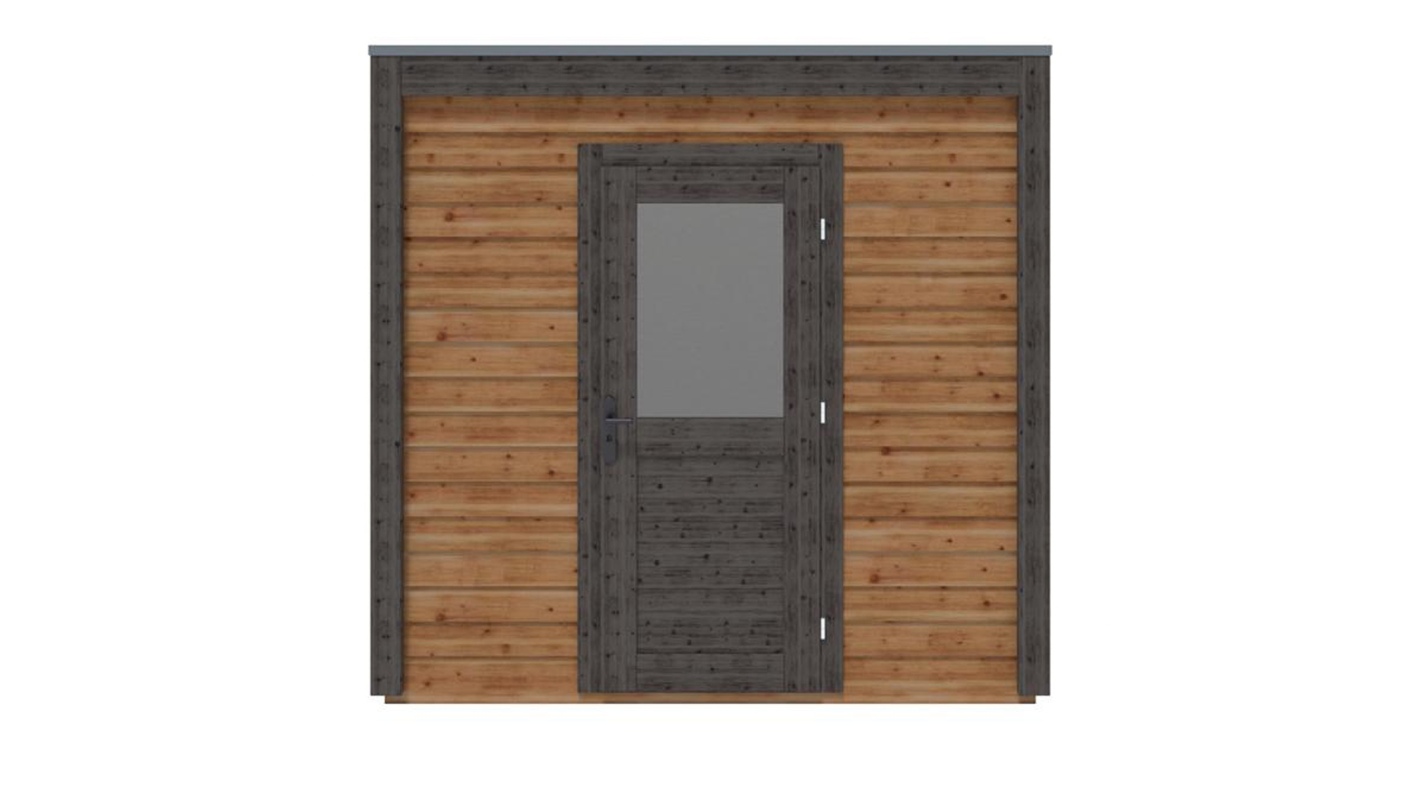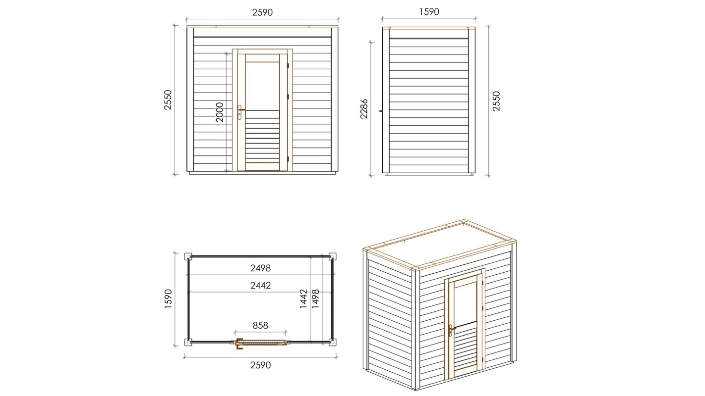 Le foto mostrano una casetta in legno 000165 con una superficie di 4.12m2, una larghezza frontale di 2.59m e una profondità di 1.59m.