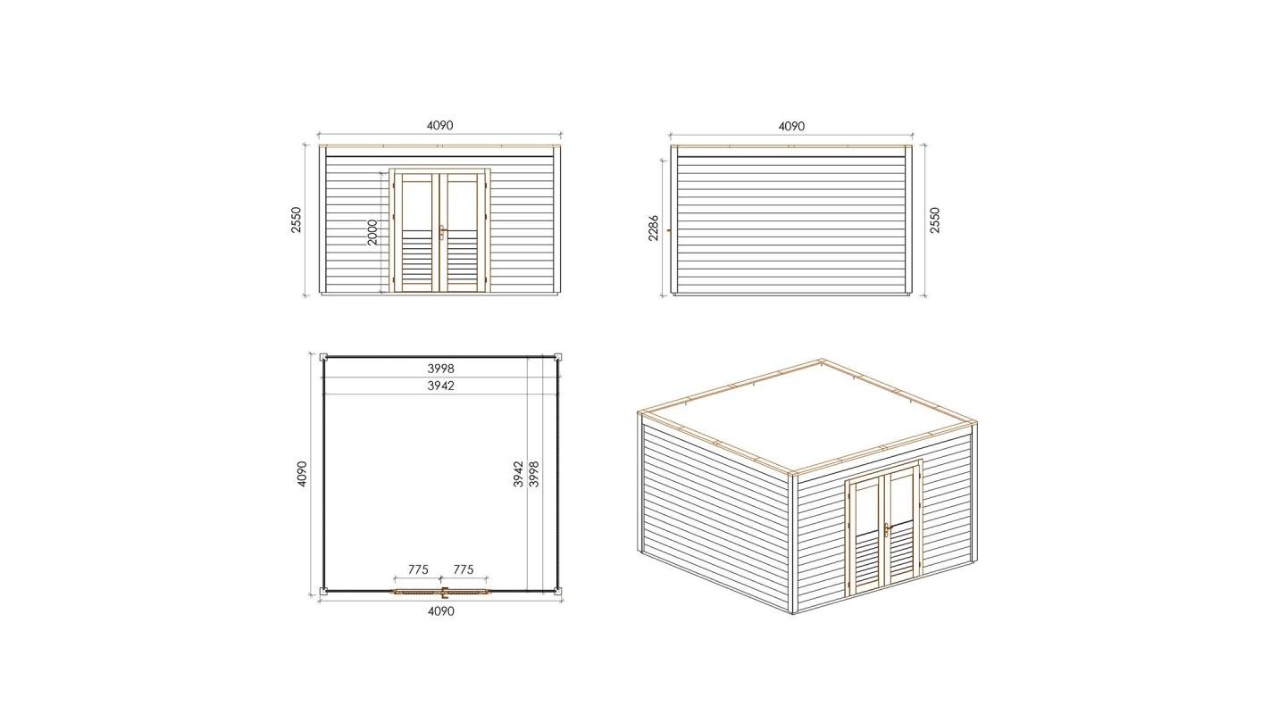 Le foto mostrano una casetta in legno 000174 con una superficie di 16.73m2, una larghezza frontale di 4.09m e una profondità di 4.09m.