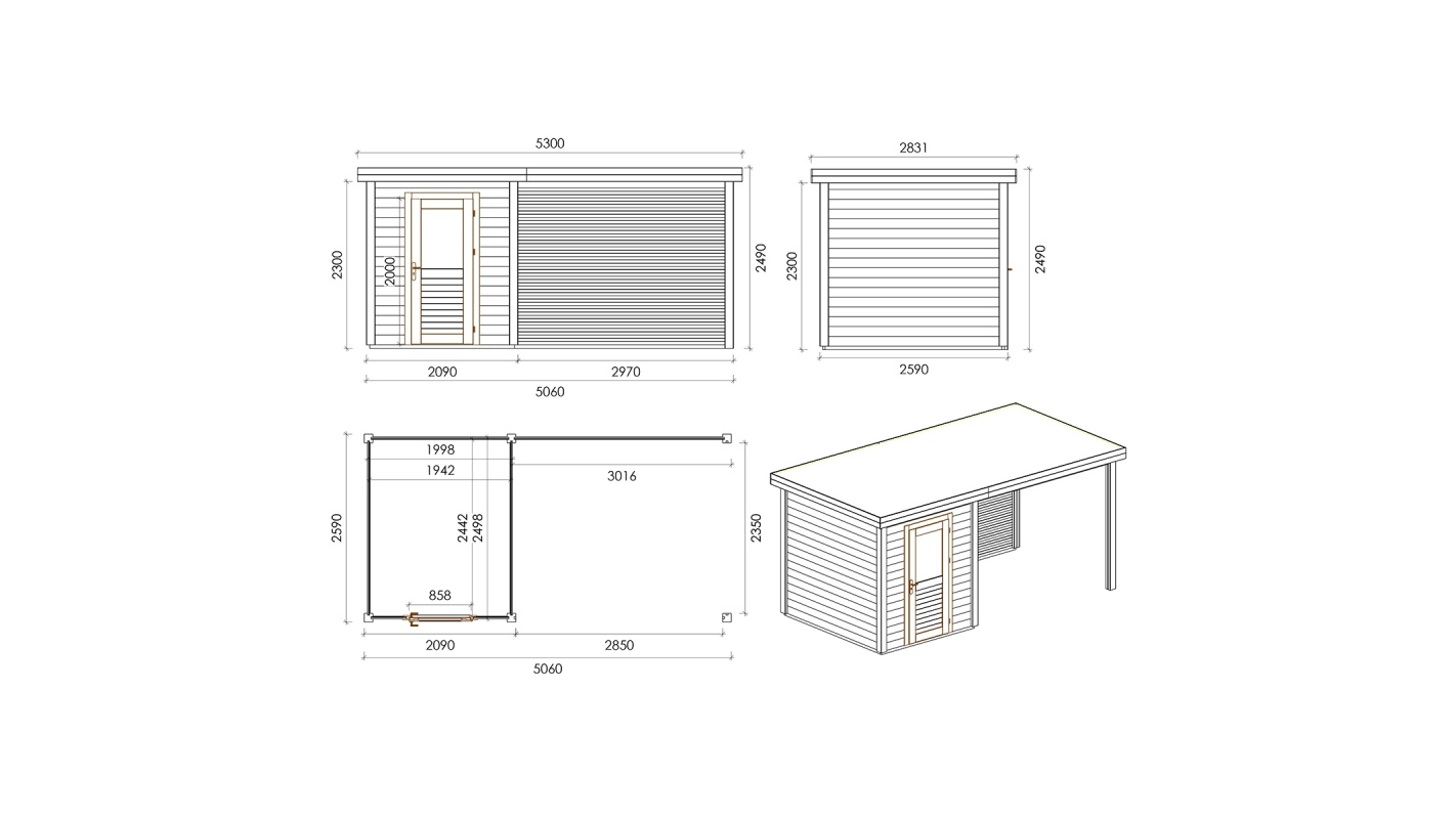 Le foto mostrano una casetta in legno 000138 con una superficie di 13.1m2, una larghezza frontale di 5.06m e una profondità di 2.59m.