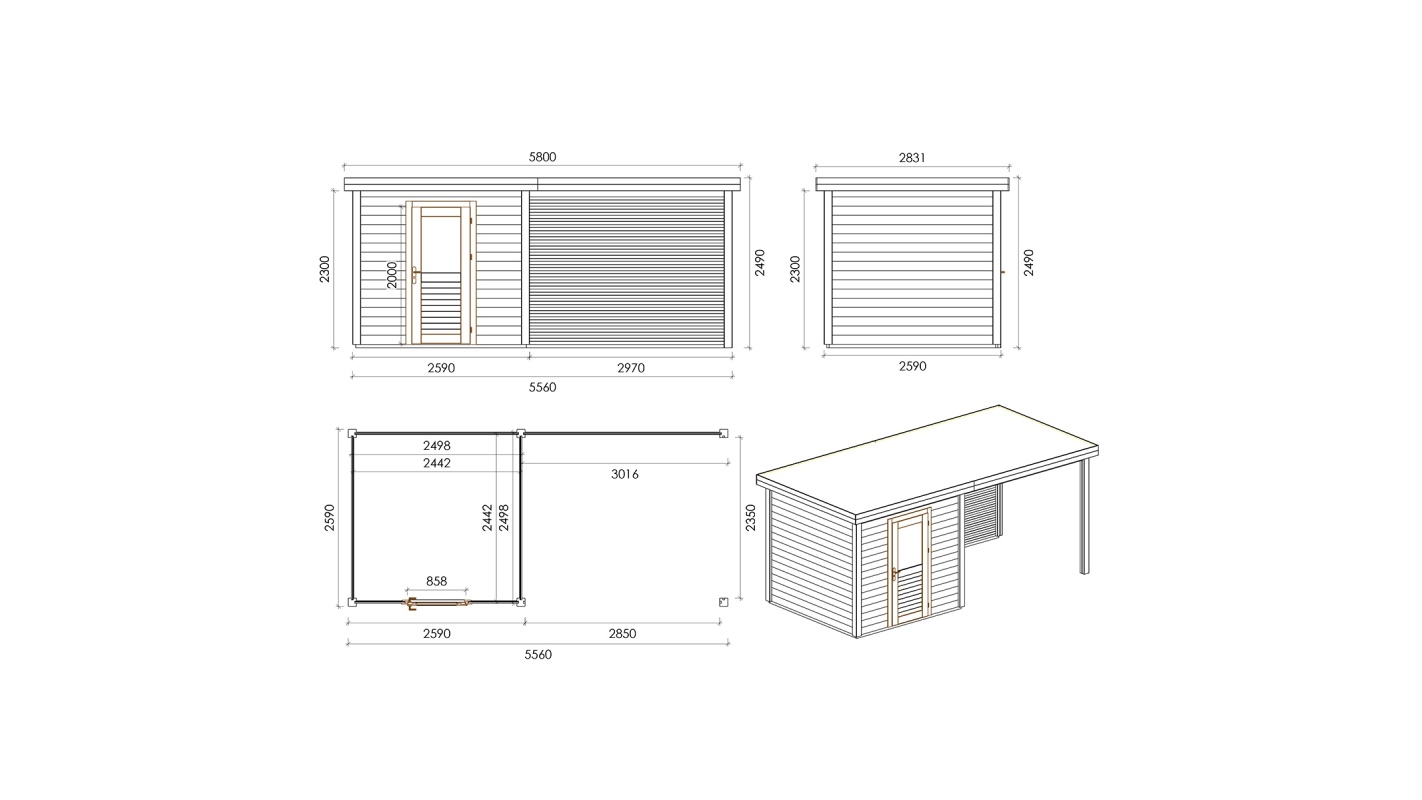 Le foto mostrano una casetta in legno 000143 con una superficie di 14.4m2, una larghezza frontale di 5.56m e una profondità di 2.59m.
