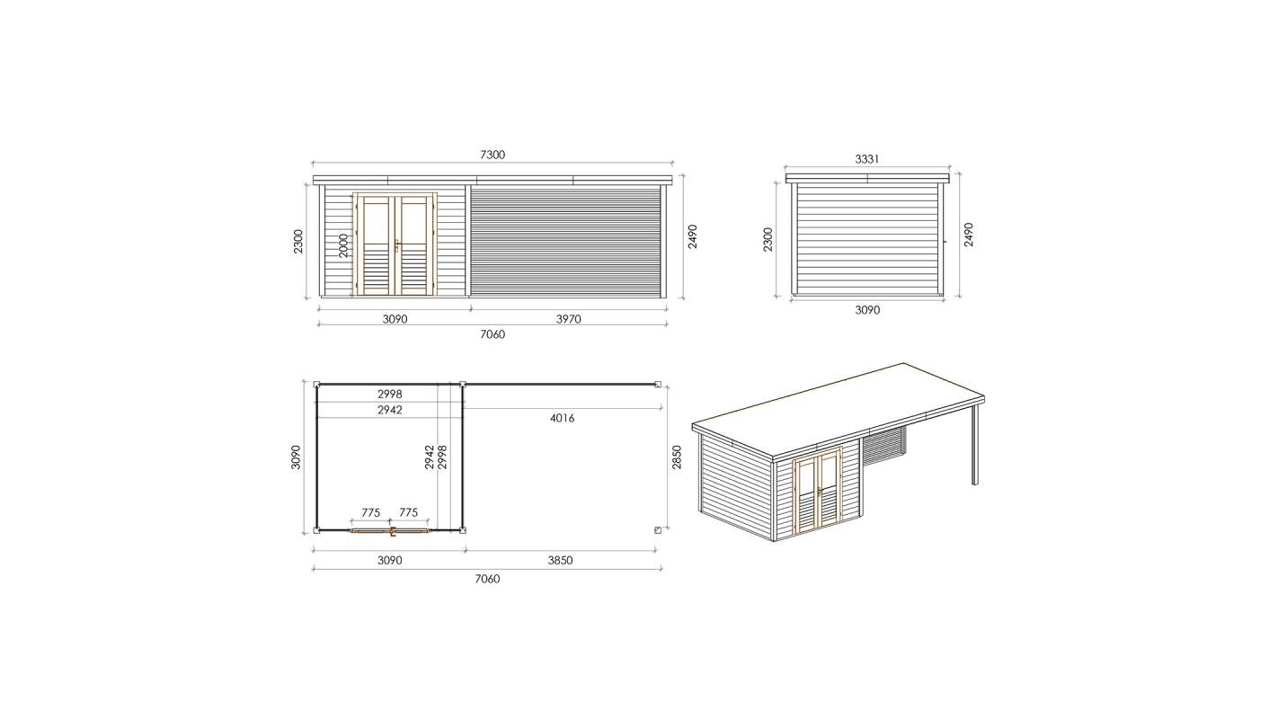 Le foto mostrano una casetta in legno 000151 con una superficie di 21.81m2, una larghezza frontale di 7.06m e una profondità di 3.09m.
