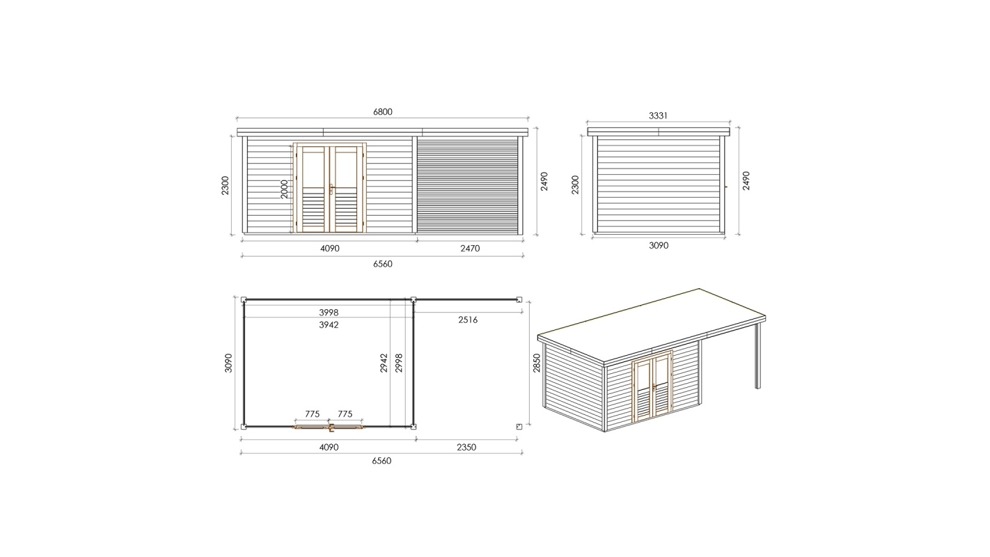 Le foto mostrano una casetta in legno 000154 con una superficie di 18.28m2, una larghezza frontale di 7.06m e una profondità di 2.59m.