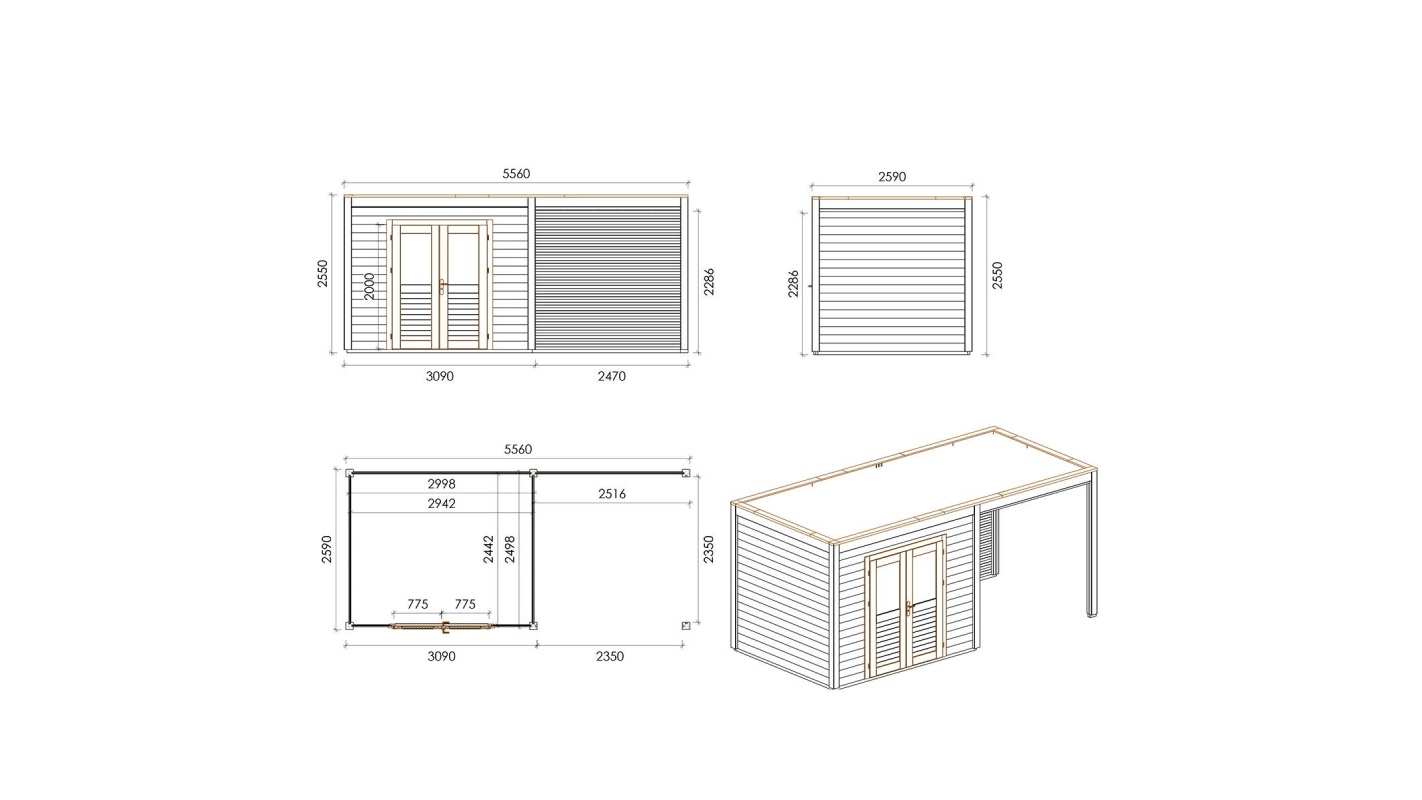 Le foto mostrano una casetta in legno 000196 con una superficie di 14.4m2, una larghezza frontale di 5.56m e una profondità di 2.59m.
