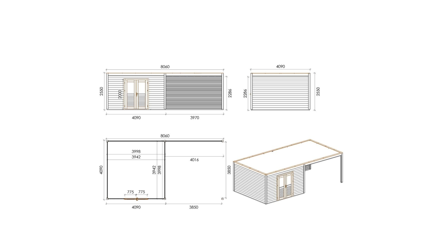 Le foto mostrano una casetta in legno 000206 con una superficie di 32.96m2, una larghezza frontale di 8.06m e una profondità di 4.09m.