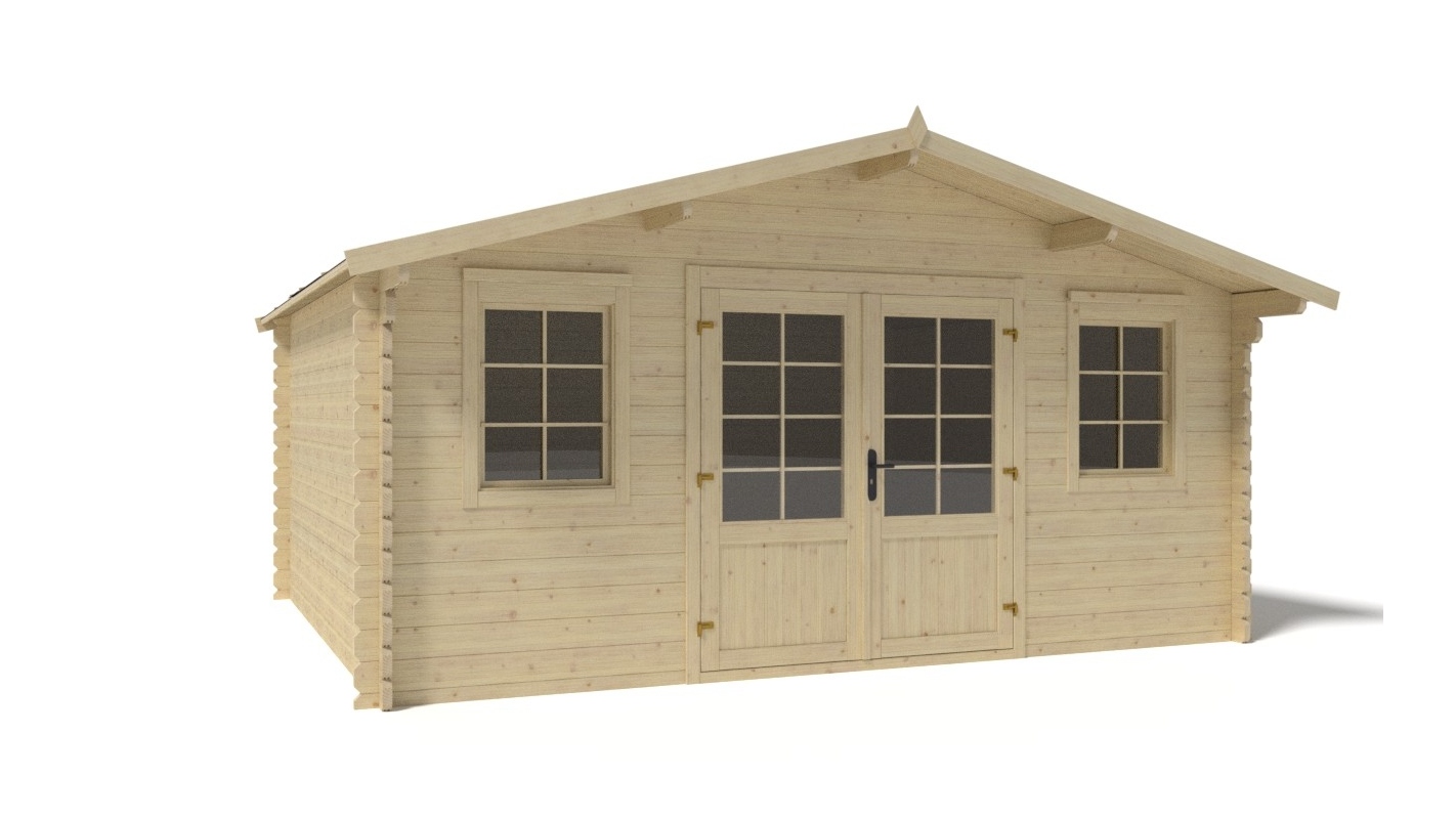 Le foto mostrano una casetta in legno DOM370 con una superficie di 19.2m2, una larghezza frontale di 4.8m e una profondità di 4m.