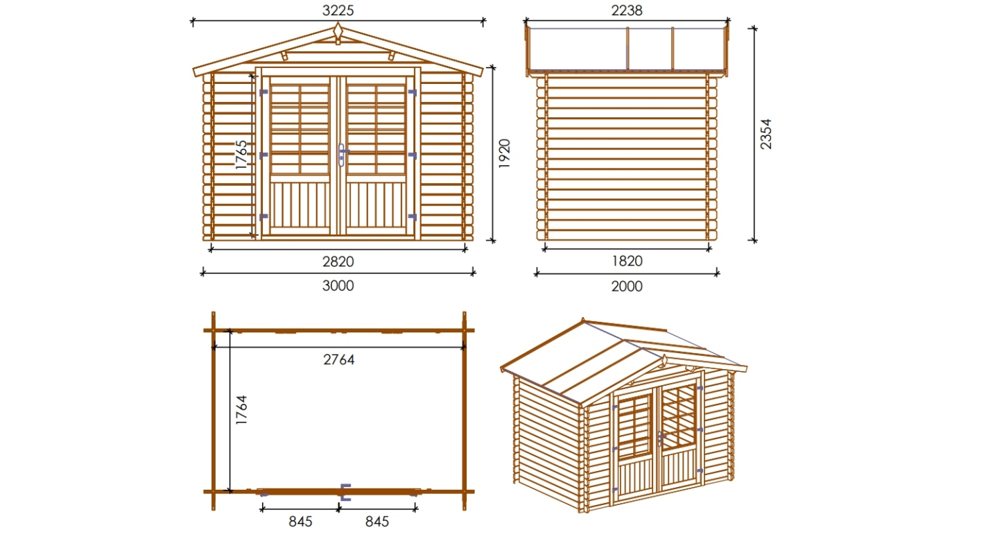 Le foto mostrano una casetta in legno DOM420 con una superficie di 6m2, una larghezza frontale di 3m e una profondità di 2m.