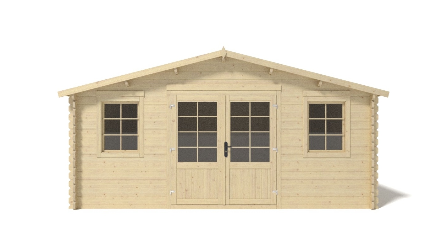 Le foto mostrano una casetta in legno DOM612 con una superficie di 25m2, una larghezza frontale di 5m e una profondità di 5m.
