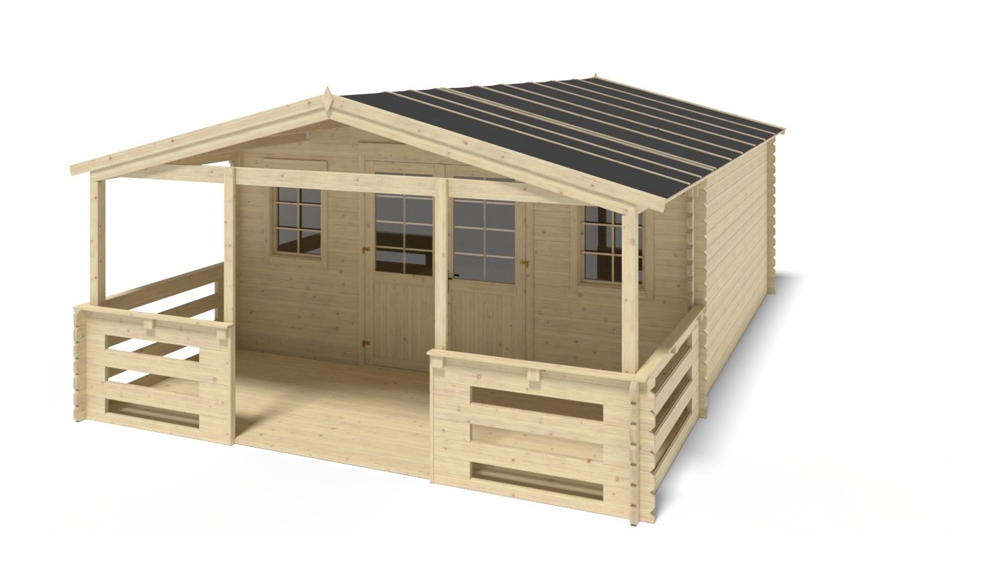 Le foto mostrano una casetta in legno DOM612+DOM613+DOM615+POD04 con una superficie di 35.00m2, una larghezza frontale di 5.00m e una profondità di 5.00m.