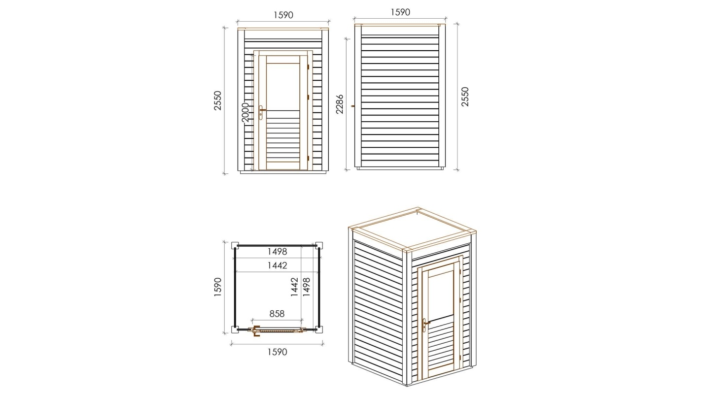 Le foto mostrano una casetta in legno 000059 con una superficie di 2.53m2, una larghezza frontale di 1.59m e una profondità di 1.59m.
