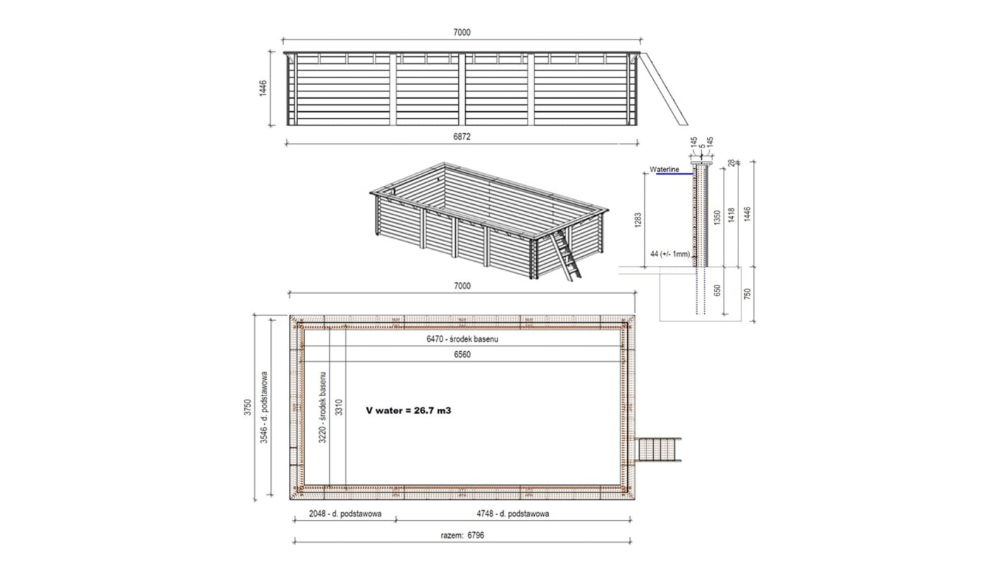 Offriamo una piscina da giardino in legno con le seguenti dimensioni 7 m x 3.75 m e di altezza 1.45 m, in legno di pino, impregnato di colore verde. Spessore della parete 44 mm (+/- 1mm), che garantisce una costruzione molto solida della piscina. Spessore del pannello di decking 28 mm.