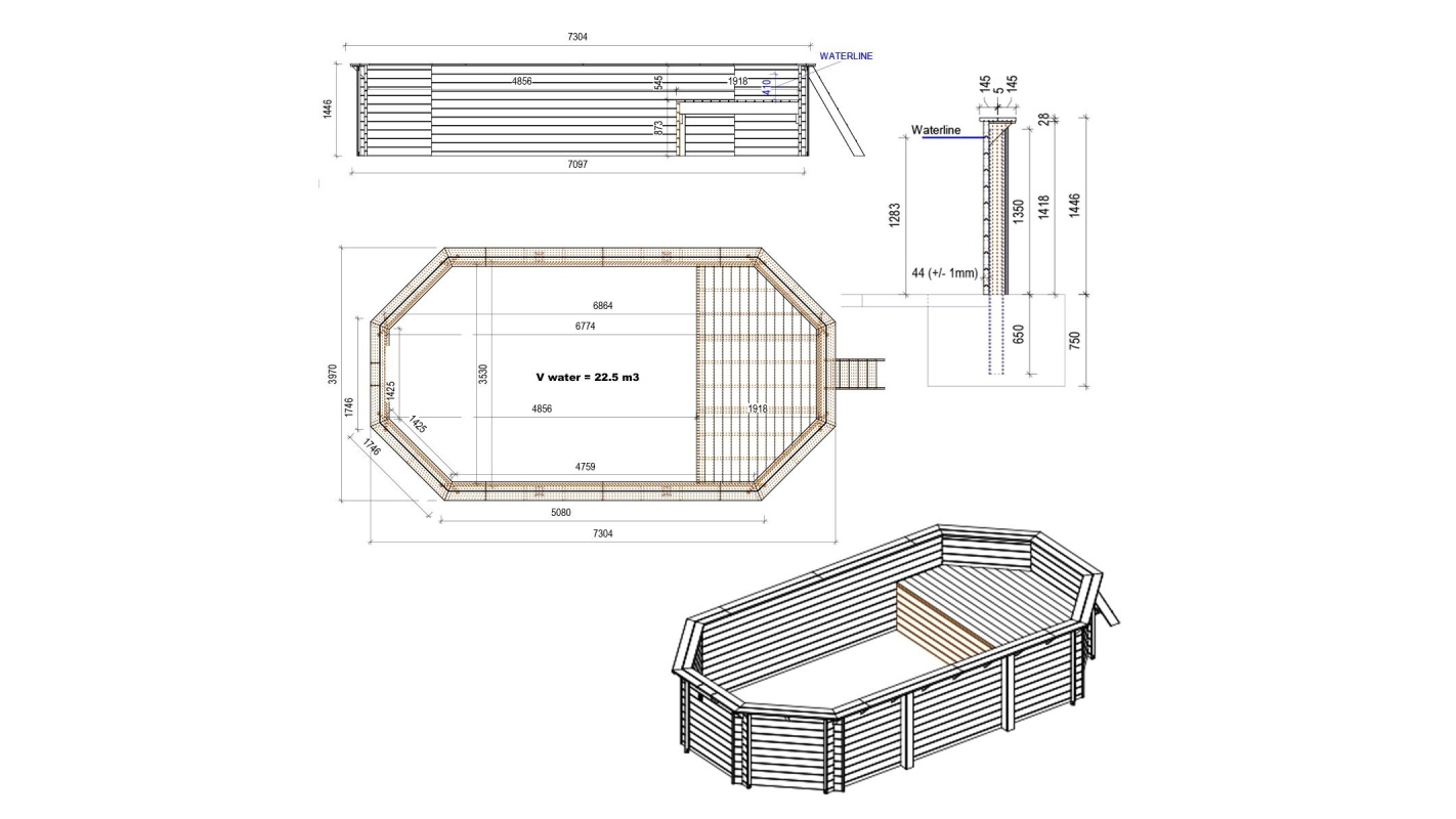 Il modello di piscina con dimensioni 7.3 × 3.97 m e altezza 1.45 m offre due livelli di profondità – progettato per chi desidera qualcosa in più di una normale piscina da giardino.