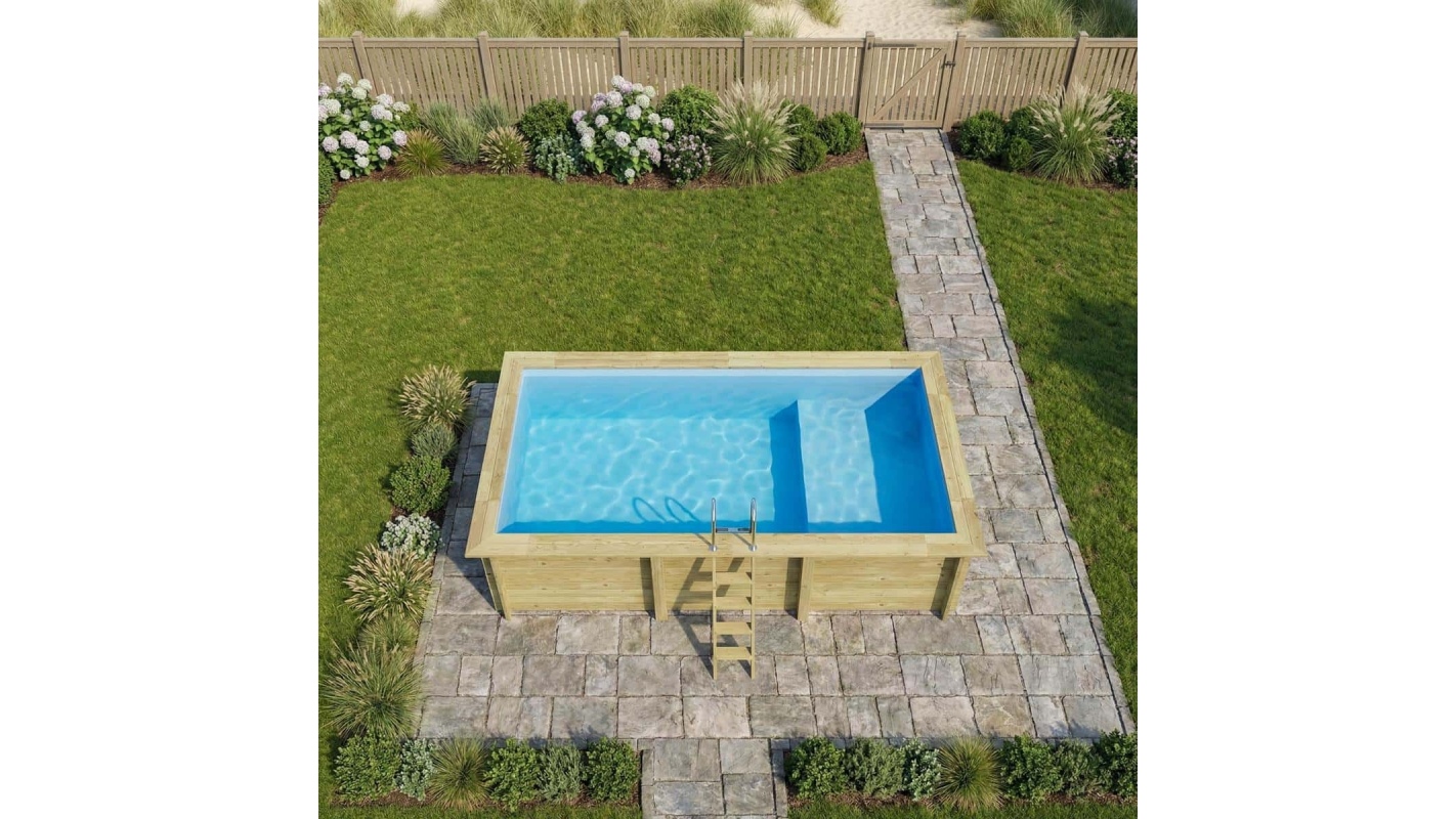 Scopri una piscina che unisce la bellezza naturale del legno, la stabilità della struttura e una soluzione unica di area relax a profondità ridotta.