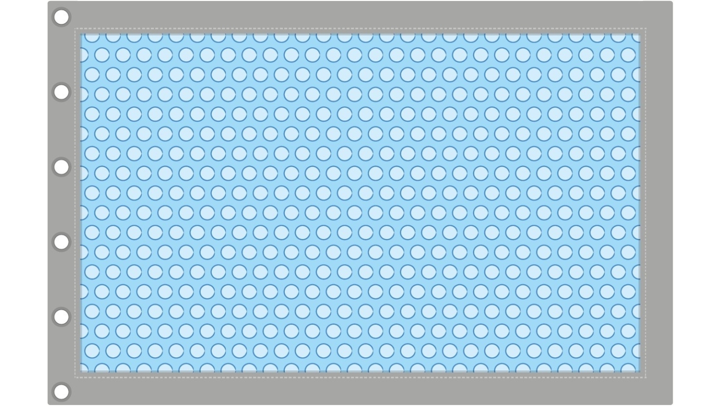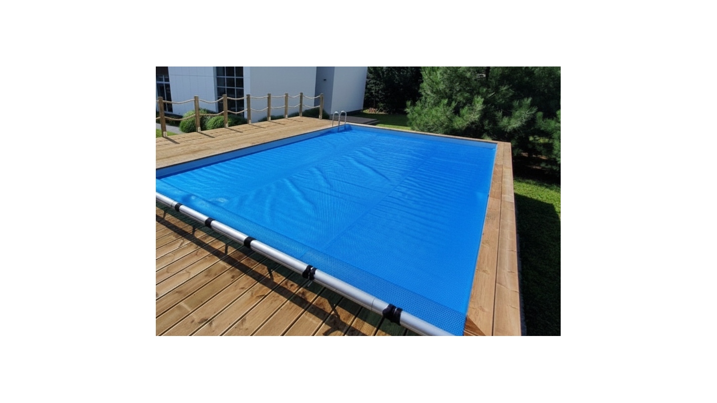 Copertura estiva a bolle per piscina, tagliata su misura in base alla forma e alle dimensioni interne della vasca.Polietilene 400 µmColore: blu scuroI bordi della copertura sono cuciti e resistenti.
